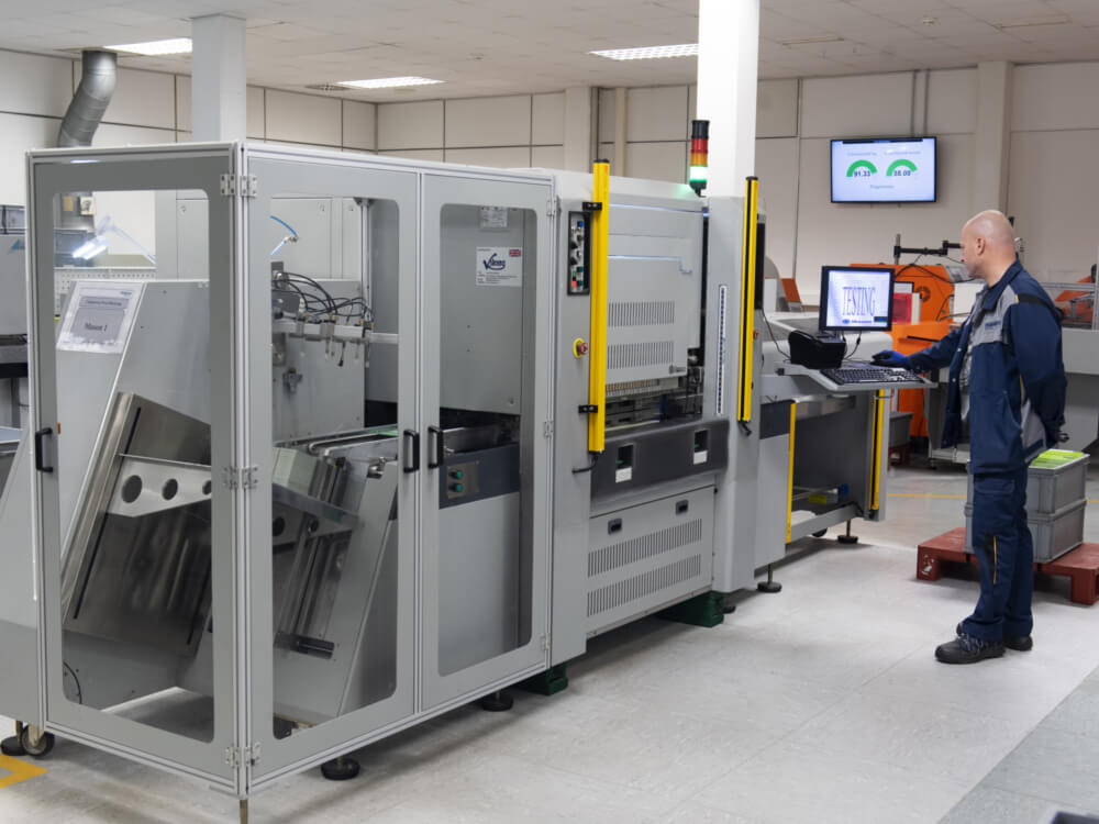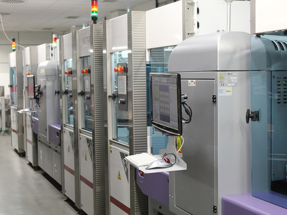 Eine letzte qualitative und quantitative Prüfung erfolgt in der Endkontrolle. Diese erfolgt über eine visuelle Kontrolle, manuell und mit dem Mikroskop, aber auch über eine AVI - automatische visuelle Kontrolle.