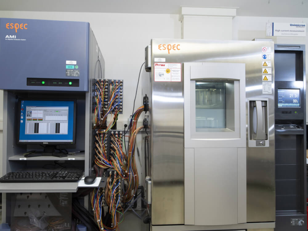 Ein sehr gut ausgestattetes physikalisches Labor rundet unser Qualitätsprofil ab. Kaum ein Hersteller verfügt über dieses umfangreiche Equipment. Dort stehen uns verschiedene Tests zur Verfügung, um den Qualitätsstandard hoch zu halten und auch Prozesse weiter zu qualifizieren: Temperaturwechseltest, CAF-Test, Tests für Isolationswiderstand und Temperaturlagerung sowie Tests mit dem Rasterelektronenmikroskop oder dem Reflow-Ofen.