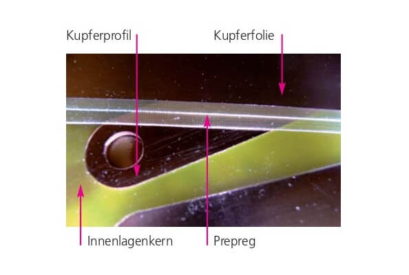Bei der Dickkupfer-Profil-Technologie werden massive Kupferteile in die innenliegenden Kerne von Multilayern eingelegt und beim anschließenden Verpressen in die Leiterplatte einlaminiert. Hierdurch wird der Kupferquerschnitt partiell dort erhöht, wo eine hohe Stromtragfähigkeit bis zu 1.000 A erforderlich ist.