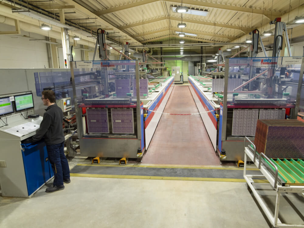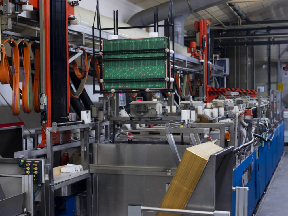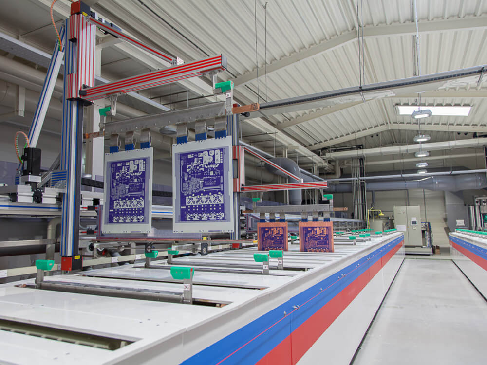 This process is computer-controlled and based on electrolysis. The PCBs run through various baths in which copper is transferred from the anode to the cathode, in this case the PCB, via current flow.
